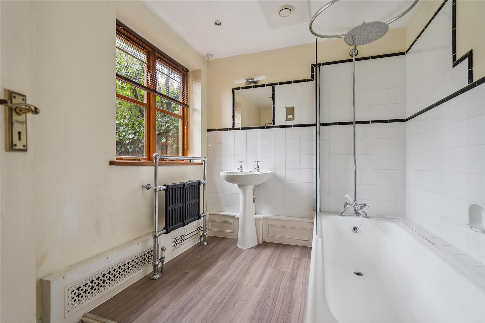 The family bathroom features a white suite with shower over the bath and a side window. The current first-floor kitchen offers further potential and could be converted into an additional bedroom or bathroom if required.